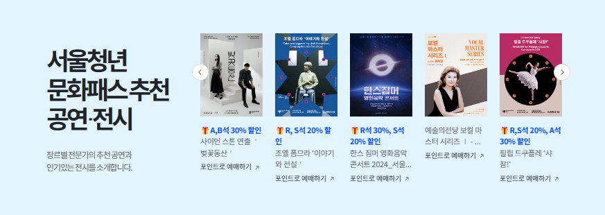 공식 홈페이지에서는 추천 전시도 알려주고 있으니 무엇을 봐야할지 모르겠다면 장르별 전문가의 추천 공연과 전시를 참고해도 좋겠죠. 이벤트 특별할인 공연도 볼 수 있으니 보다 저렴한 가격으로 양질의 공연과 전시를 관람하세요.