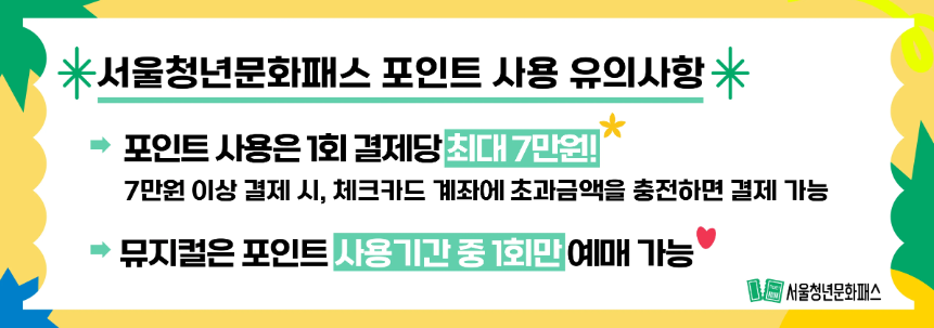 연극, 뮤지컬, 콘서트, 전시회 등 다양한 문화예술 공연과 전시를 관람할 수 있도록 지원금 제공합니다. 예술 관련 워크숍, 강연, 교육 프로그램에 참여할 수 있는 기회와 청년 예술가들의 창작 활동을 지원하는 프로그램 제공합니다. 카드 발급 즉시 20만 포인트가 충전되며, 실물카드 수령 후에 사용이 가능합니다. 예매 건당 최대 7만원까지만 사용이 가능하다는 점 알고 있나요? 공연이 7만원 초과하는 경우에는 체크카드 계좌에 초과 금액을 본인부담금액으로 충전하면 결제가 가능하니 꼭 알아두세요. 뮤지컬 장르는 1회만 공연예매가 가능하답니다.